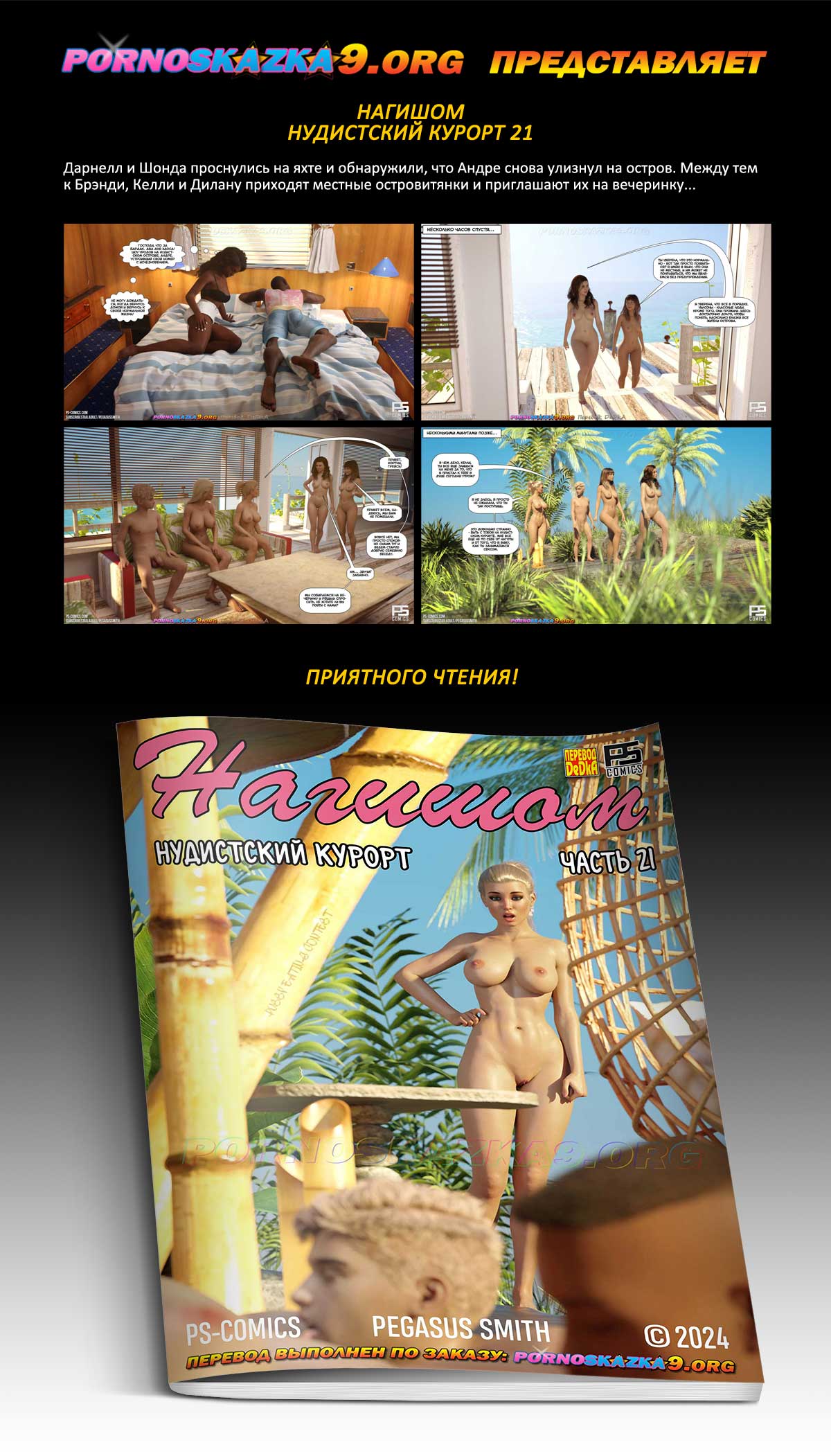 Порно комикс «Нагишом. Нудистский курорт. Часть 21.» Дарнелл и Шонда проснулись на яхте и обнаружили, что Андре снова улизнул на остров. Между тем к Брэнди, Келли и Дилану приходят местные островитянки и приглашают их на вечеринку…