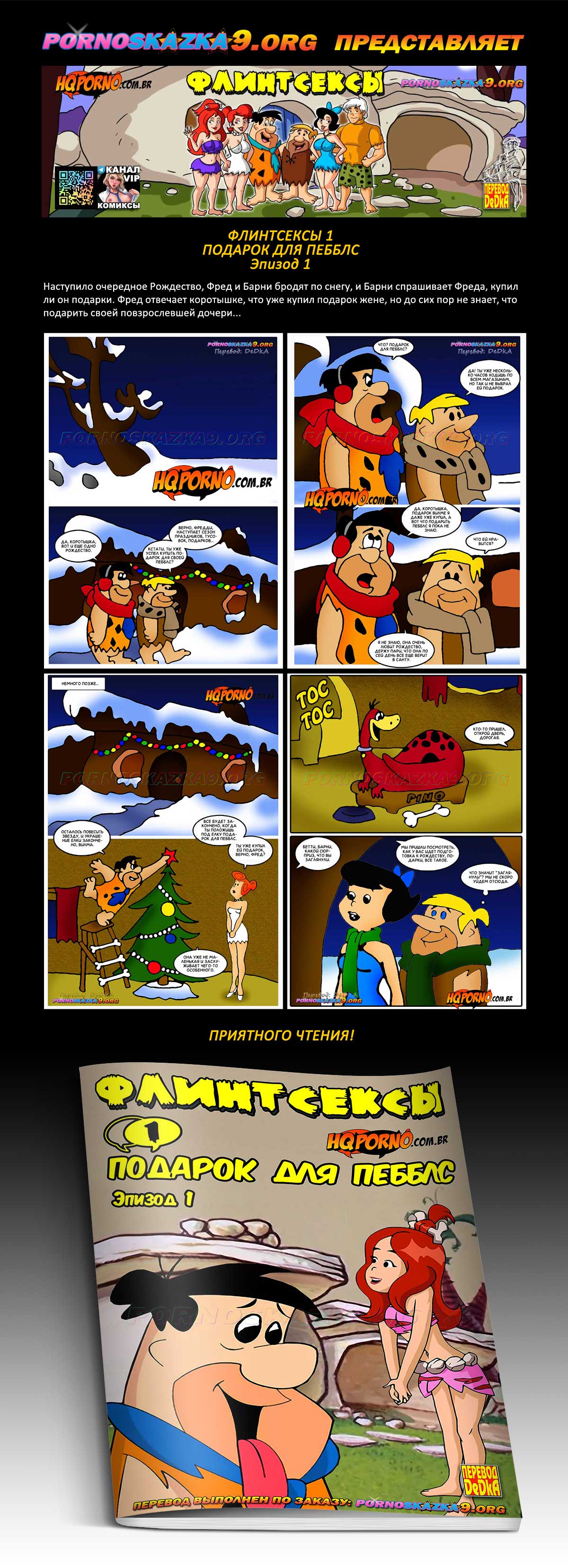 Порно комикс «Флинтсексы. Часть 1. Подарок для Пебблс. Эпизод 1. Флинстоуны.» Наступило очередное Рождество, Фред и Барни бродят по снегу, и Барни спрашивает Фреда, купил ли он подарки. Фред отвечает коротышке, что уже купил подарок жене, но до сих пор не знает, что подарить своей повзрослевшей дочери…